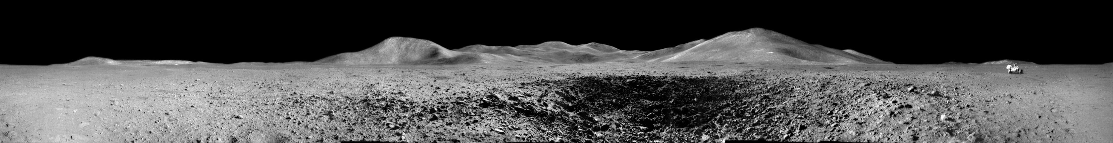 Above is a 180 degree pan of Apollo 15 station 2, assembled from a series of photos. It shows the view from the lower slopes of Mount Hadley Delta. The valley in the middle of the panorama is Hadley Rille, an ancient lava channel. The rille is about a mile wide - much bigger than it looks. Also prominent to the right are the hills of the Swann Range and the bulk of Mount Hadley, mostly in shadow.