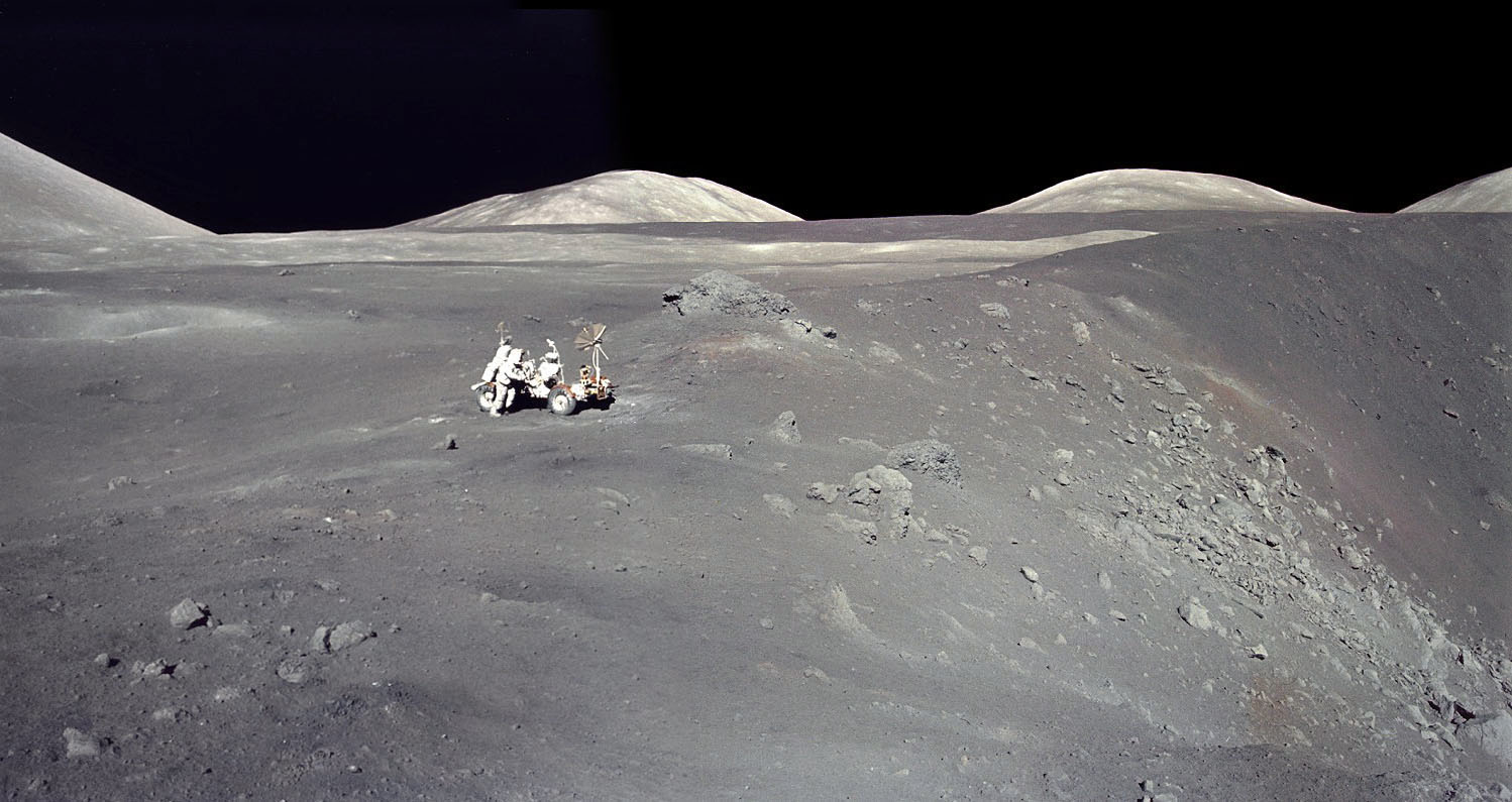 View of the last Apollo landing site in the Taurus Littrow valley, taken from the Apollo 17 lunar module. The exact landing site was in the middle of the valley, just right of the distant command module in this picture.