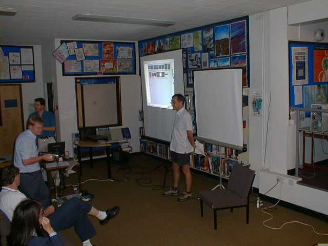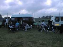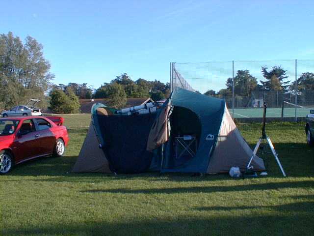 The 2002 astro-campThis year a third night of camping was added to last year's two. Many of our 'astro-campers' come a long way to visit AstroWest so the extra night was widely welcomed (and likely to be added to further next year).Grahame Veale (Torbay AS vice-chairman and Head of Science at the Torquay Boys' Grammar School) arrived early on the first day (Thursday) to open up all the kitchen, shower and toilet facilities. As an event organiser and principal contact for the astro-camp, Grahame was soon welcoming a steady flow of arrivals from around the country. The first night of observational activity was particularly successful once the first quarter moon had set. The cool and calm air across the main school field was soon host to a wide range of astronomical instruments. The school's 19-inch reflector peered into the dark sky and some very impressive equipment brought to the site by the campers was in full action. Altogether, a scene of peaceful contemplation of the heavens interrupted only by the occasional whirring of a 'goto' scope seeking its next target. The second (Friday) evening saw the arrival of Dave Norman (chairman of event hosts, Torbay Astronomical Society) along with fellow event organisers John Parratt (with his younger daughter, Stacey) and Kieron McGrath, owner of major south-west dealer SCS Astro. As he did last year, Kieron once again arrived in a van-full of telescopes and other exciting astronomical gadgets and goodies! (click on any image to see the full version) The Public Open DayThe campers awoke Saturday morning to the sound of the local seagulls on another pleasant day ...The day's programme officially commenced at 11am with the opening of the trade exhibition. These included Kieron McGrath of SCS Astro, displaying a wide range of telescopes for visitors to buy and look at.