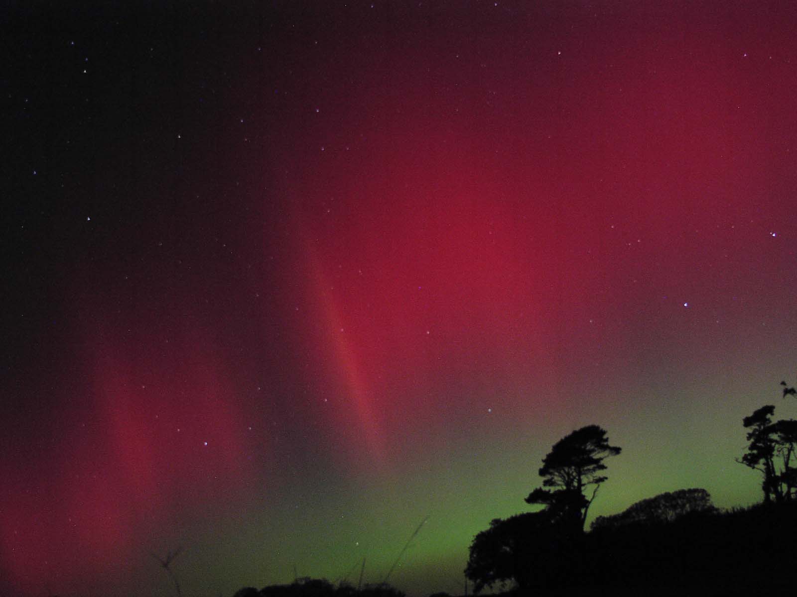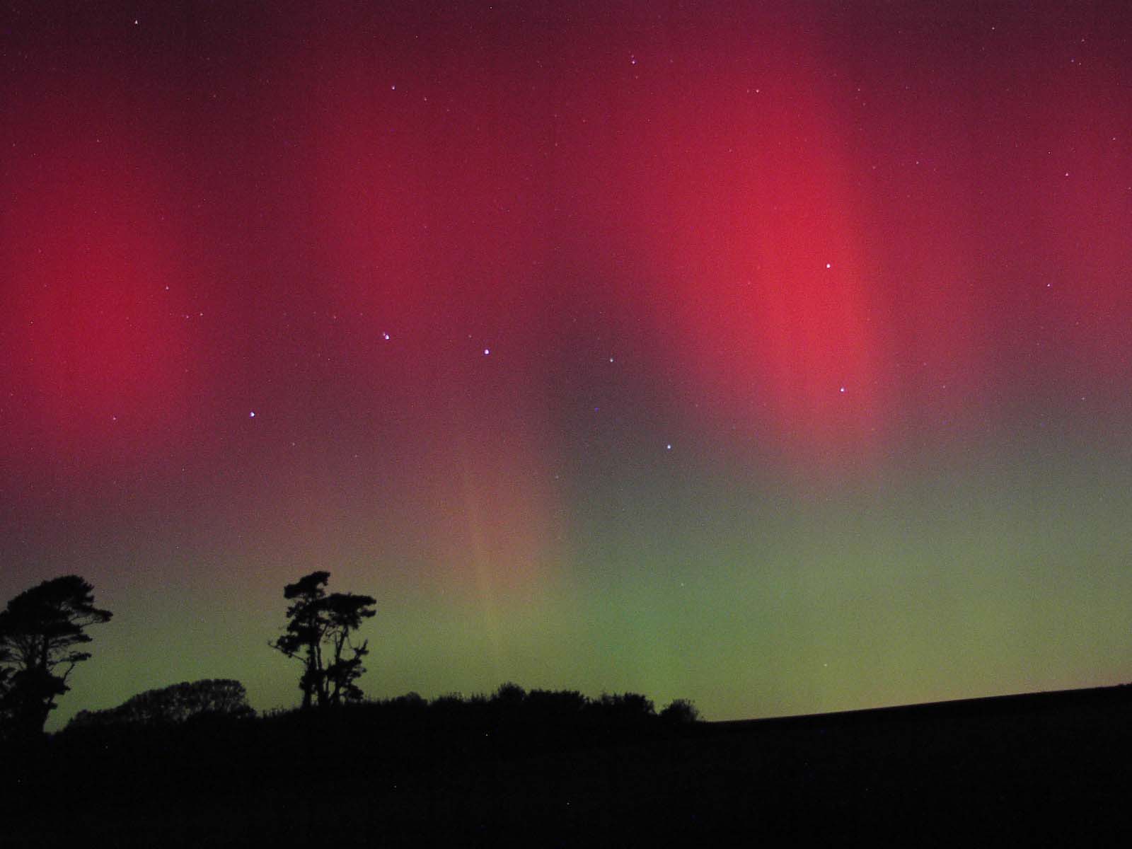 AURORA over TORBAY on October 21st, 2001The spectacular auroral images below (click to see large scale) were taken by society member Martin Bastion on the evening of Sunday 21st October, 2001 from the lanes near Nortel / Whiterock, between 9.30 and 10pm. Exposures vary between 8 and 16 seconds, F1.8, with the camera set to 400 ISO. The first two show the aurora with (left, part of) the Plough visible in the background (double star Mizar and Alcor clearly visible in the Plough's handle) and the third is set against Hercules, Corona Borealis and Bootes.The reds and greens are mainly due to excited oxygen atoms. The display was initially caused by the eruption of the first of two category X1.6 solar flares from sunspot number 9661 at 0105UT on October 19th. This sent a coronal mass ejection (CME) in the direction of the earth, reaching the Earth's magnetosphere at 1650UT on October 21st.