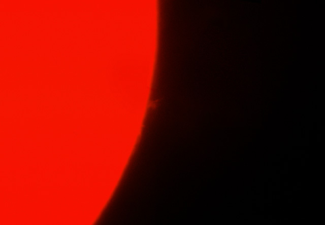 Prominences photographed on 8th January 2001. A large eruptive prominence appeared in the 15 minutes between the first and second photographs. |